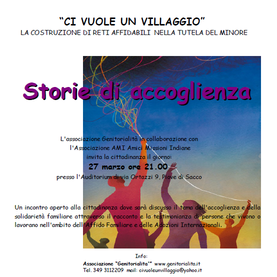 Tale serata, aperta a tutta la cittadinanza, sarà presentata da professionisti dell’Associazione AMI Amici Missioni Indiane ed avrà come tema l’accoglienza e la solidarietà familiare nelle sue varie forme, raccontata attraverso storie e racconti di chi ha a che fare quotidianamente con questi aspetti.